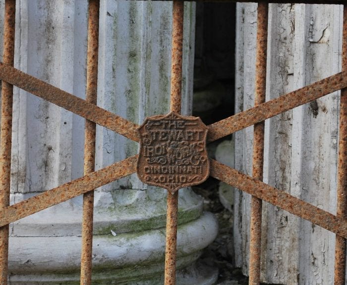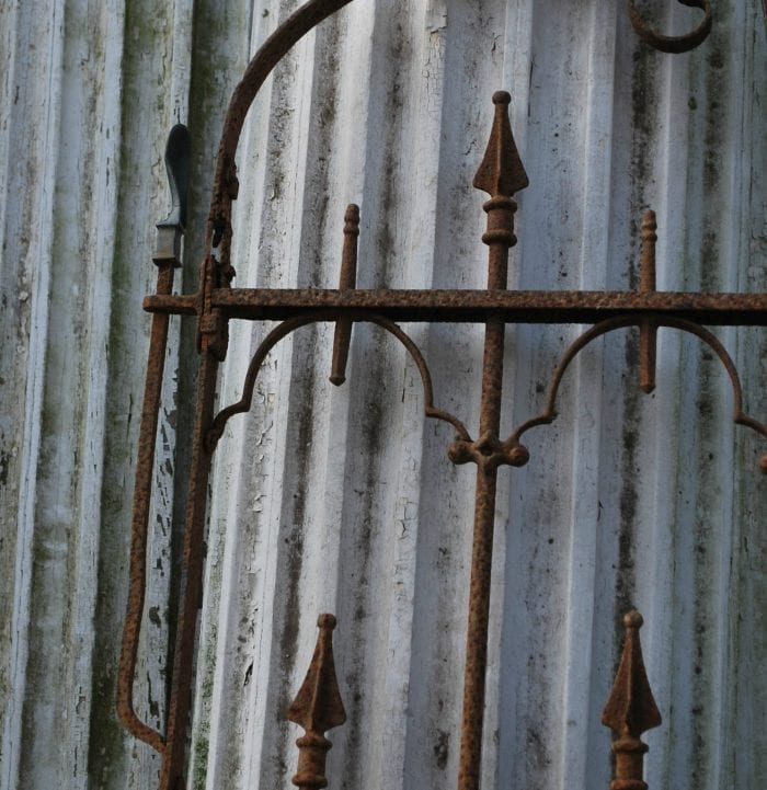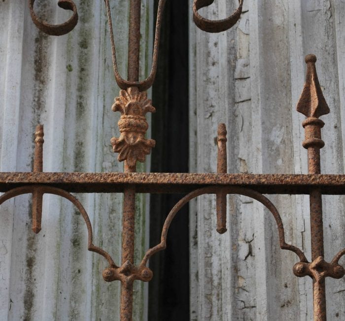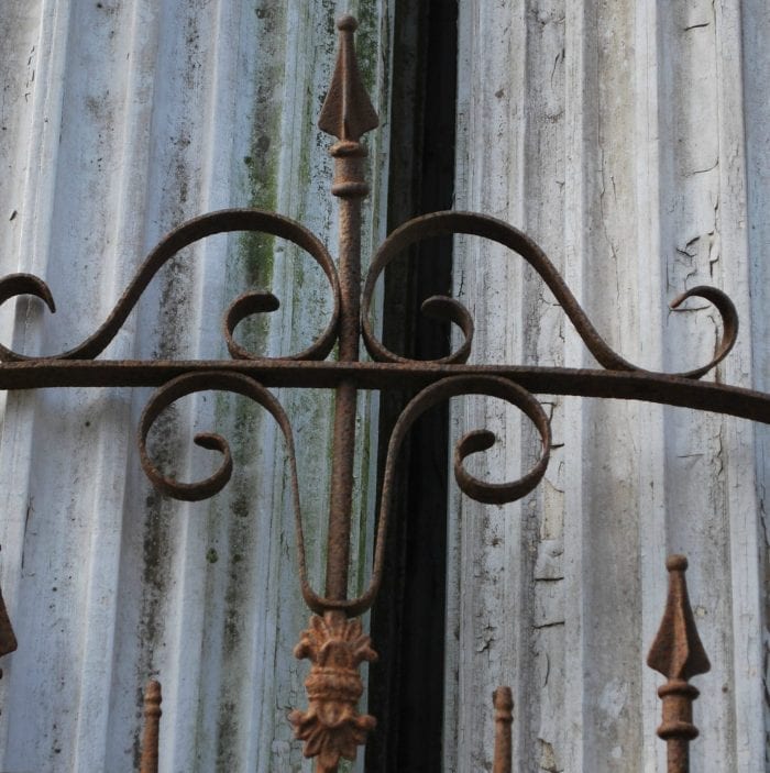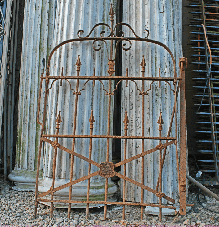 This gate, manufactured in Cincinnati, Ohio by the Stewart Ironworks Company, measures 37″ wide with the mounting hardware and primitive latch, or 31-1/2″ wide as just the gate. It measures 52″ tall at the center, and 42″ tall at the sides. It needs a weld at the bottom right corner, the top finial is slightly bent, and may need some bondo work at the top left, but is otherwise in great shape for its age. There is a great makers plaque at the center, pictured in the gallery of images. The primitive latch is still functioning. The gate comes with the portion of the hinge that bolts to your fence post and the rod that attaches your gate to the hinge. The iron details on this gate are exquisite. Please call for a shipping quote if you are interested in this gate as we cannot ship it using UPS.