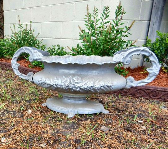 This planter is made of cast aluminum. The planter comes without a finish, we suggest you paint it.