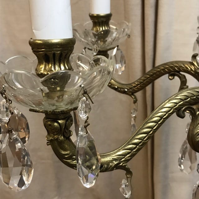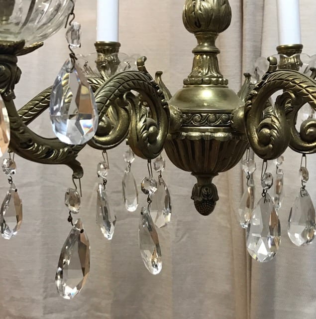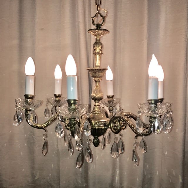 This Spanish Cast Brass 6 arm Chandelier is rewired and ready to hang. It features six brass arms with crystal baubaches wired for standard base lamps (no greater than 40 watts each). It is marked at the top with the made in Spain logo. It was probably manufactured between 1950 and 1965. It has crystal tear drops which refract the light perfectly.